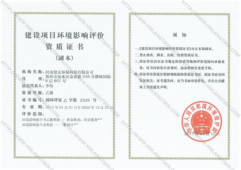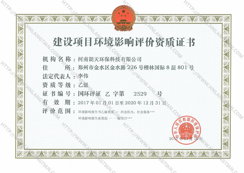 河南朗天環保科技有限公司,原為河南農大風景園林規劃設計院環境研究所,于2005年6月30日正式取得由國家環境保護部頒發的環境影響評價乙級資質證書(國環評乙字第2529號),注冊地址鄭州市金水區金水路226號楷林國際8層801號,注冊資金500萬元。主要從事環境影響評價、環保技術咨詢、土壤環境調查、第三方環境監查及督導、竣工環境保護驗收、突發環境事件應急預案、區域環境現狀評估、排污許可申報、清潔生產審核、環境工程治理、空氣質量精細化管控(專家組)等。公司在“以質量求生存、以信譽求發展”經營理念的指導下,秉承改善人類環境、實現最佳經濟效益與環境效益之宗旨,倡導科技創新之精神,依托雄厚的技術力量,致力于環境影響評價工作及環境工程技術咨詢的科研工作。